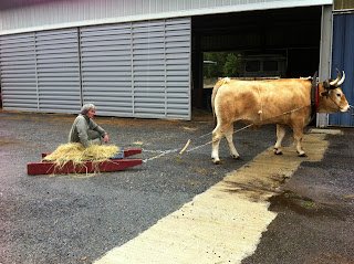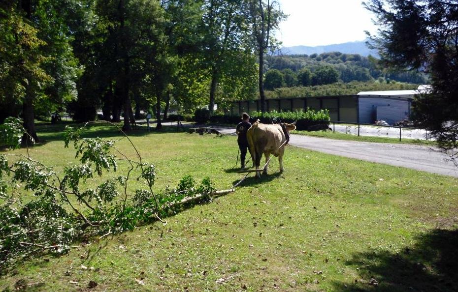 Deux jours par semaine, pendant cinq mois, il venait m’aider à les faire travailler : marcher sur la route, les habituer aux événements extérieurs, au bruit, à l’approche des gens, à la musique, à croiser les voitures et enfin à les atteler aux outils anciens que nous avons restaurés : faucheuse- faneuse- chariot- herse- semoir etc…