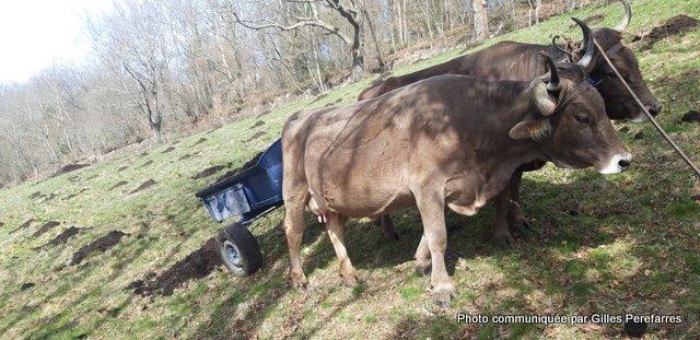 Deux mois passent et l’échographie ne détecte rien. D’échec en échec, il fallait se rendre à l’évidence, il n’y avait rien à faire. Bon! Puisque ma Grive n’était bonne à rien, j’ai voulu prouver qu’elle avait d’autres qualités ! Je me suis mise à lui faire tracter dans un premier temps un pneu. En fait, elle adorait cet exercice, et progressivement une petite herse remplaça le pneu. Cette année-là, j’ai été invitée dans dix foires pour des démonstrations de travail aux champs.