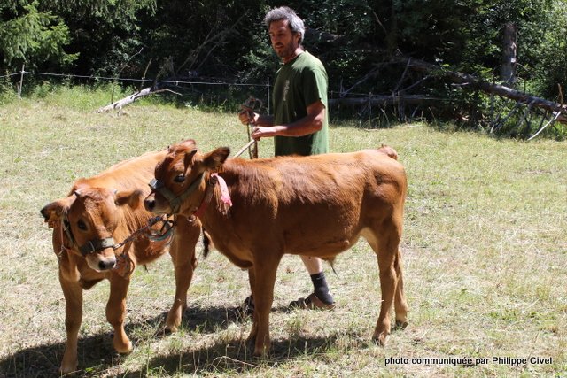 Ainsi, avant même d’arriver à destination, d’anciens et de nouveaux participants se rencontrent, renouant une fois de plus avec ce faisceau de contacts qui composent le réseau des bouviers : agriculteurs et éleveurs locaux spécialisés dans les Vosgiennes et éleveurs d’autres régions qui protègent et affinent leurs souches génétiques à double usage (viande et lait), comme pour la Ferrandaise. Philippe semble être le seul éleveur de France à avoir conservé son cheptel destiné à la triple utilisation (viande-lait-énergie).