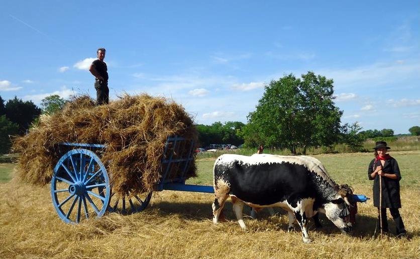 La paire de boeufs Vosgiens était attelée à une gerbière, pour ramasser les gerbes de blé. Ensuite ces gerbes étaient amenées à une batteuse pour en extraire le grain. Ce fut l’occasion aussi d’échanger avec les anciens présents.