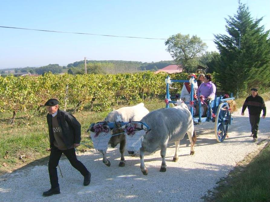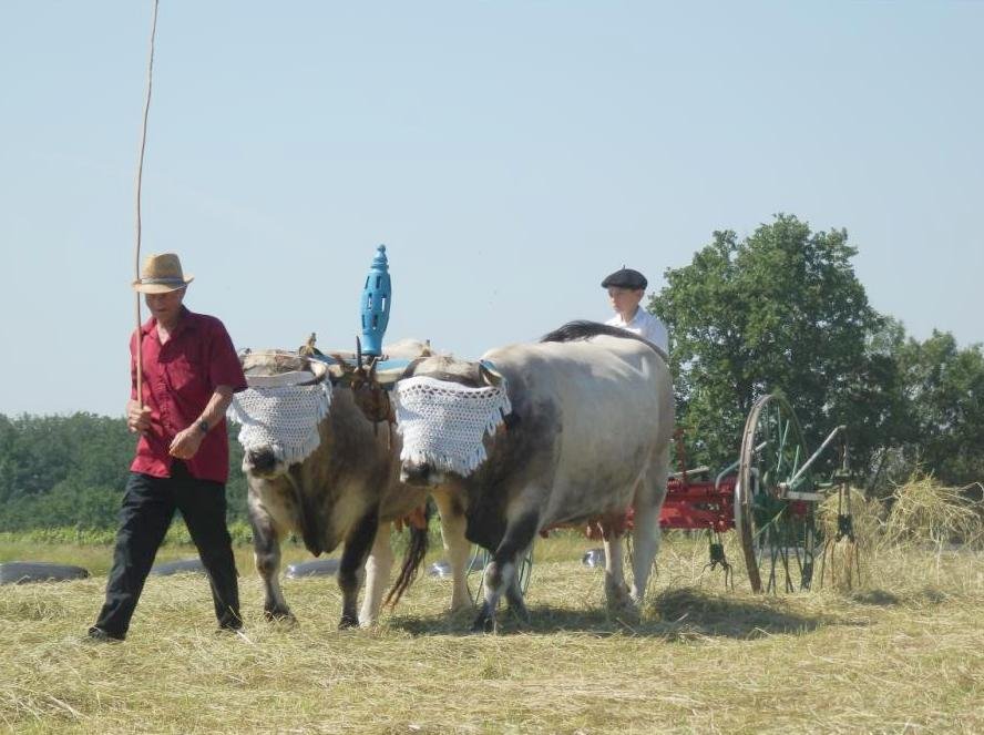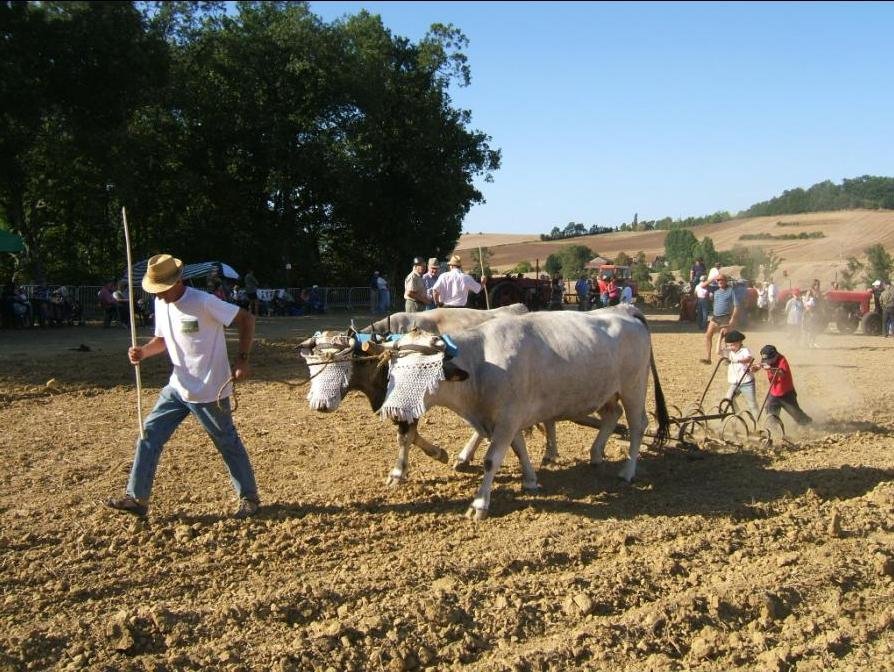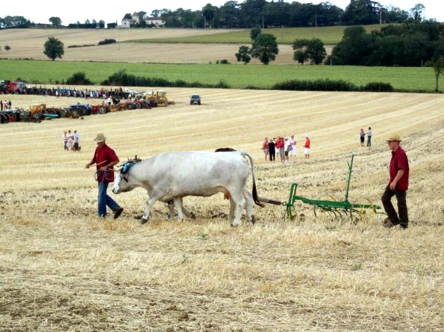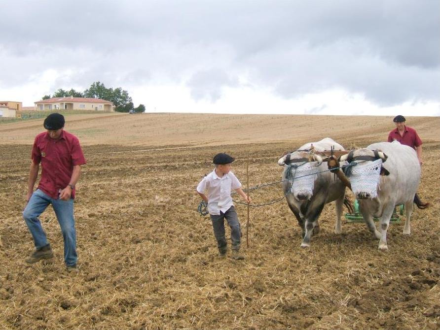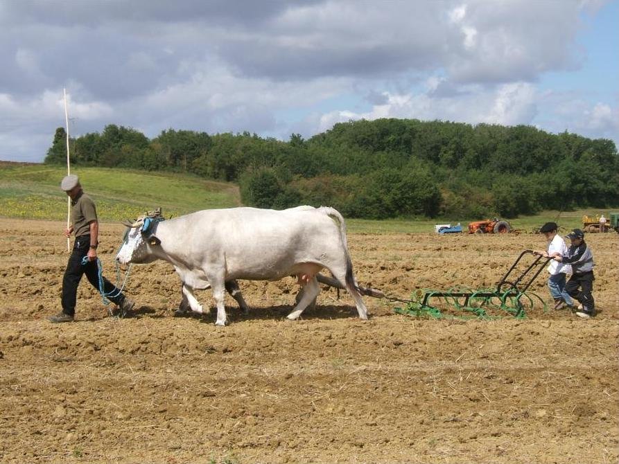 Il a une paire de vaches Gasconnes attelées sur son exploitation et les utilise pour réaliser ses travaux. Il fait ses labours, son fumier, ses charrois, sort du bois, fait ses foins avec ses animaux.