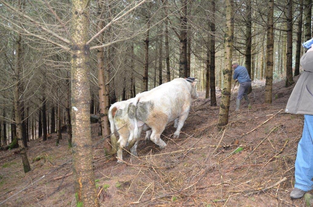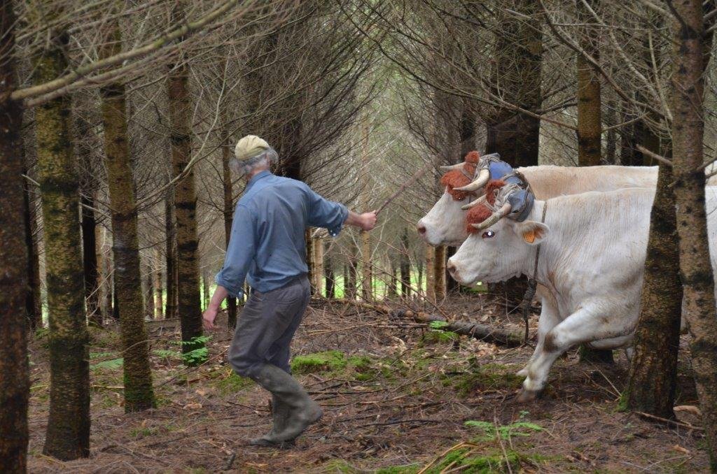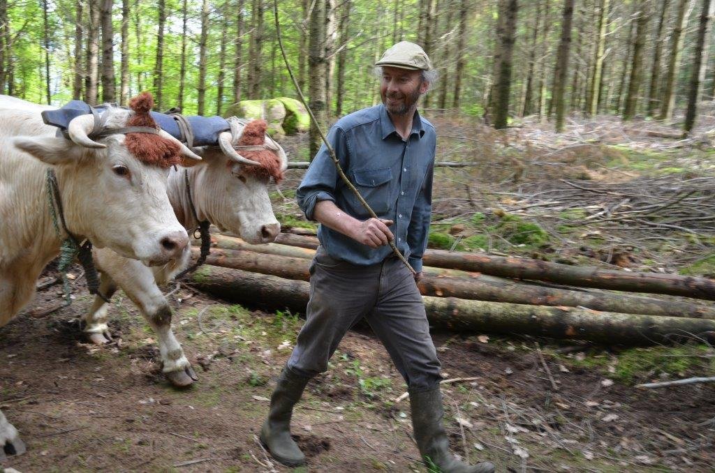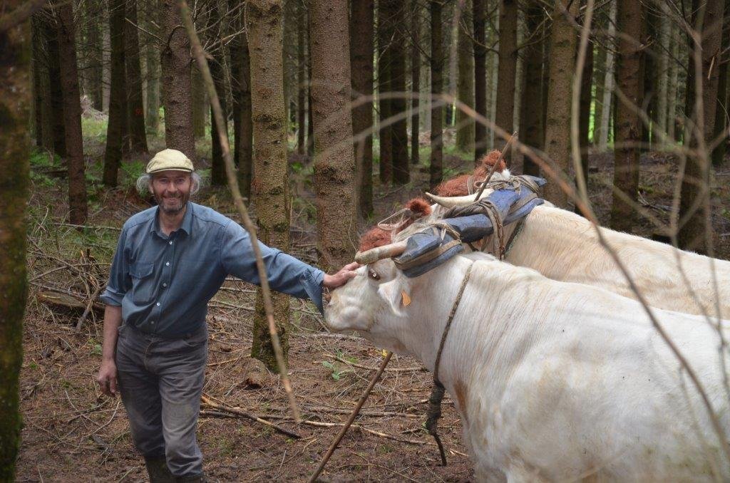 Il vient de débarder avec son boeuf Froment et sa vache Azalée, des éclaircies de sapins Douglas destinées à être sciées pour faire des barricades destinées à des reprises de clôture.