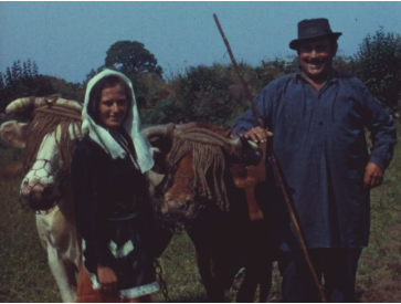 Image tirée du filmVoir le film : en cliquant iciSemence des pommes de terre après labour du champ avec des vaches en 1973.
