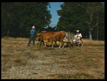 Image tirée du filmVoir le film : en cliquant iciTravail des champs à Crégols en été 1943 à l’aide d’une faucheuse tractée par deux boeufs.