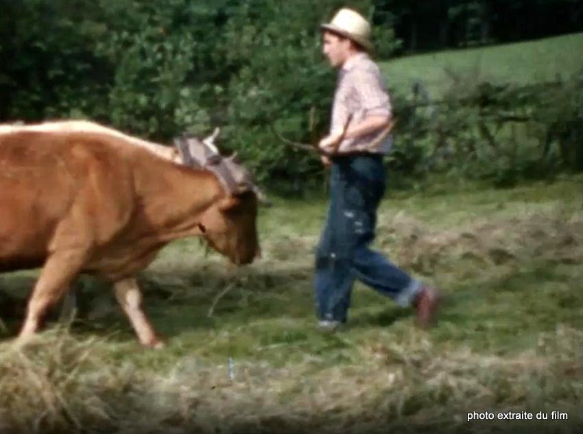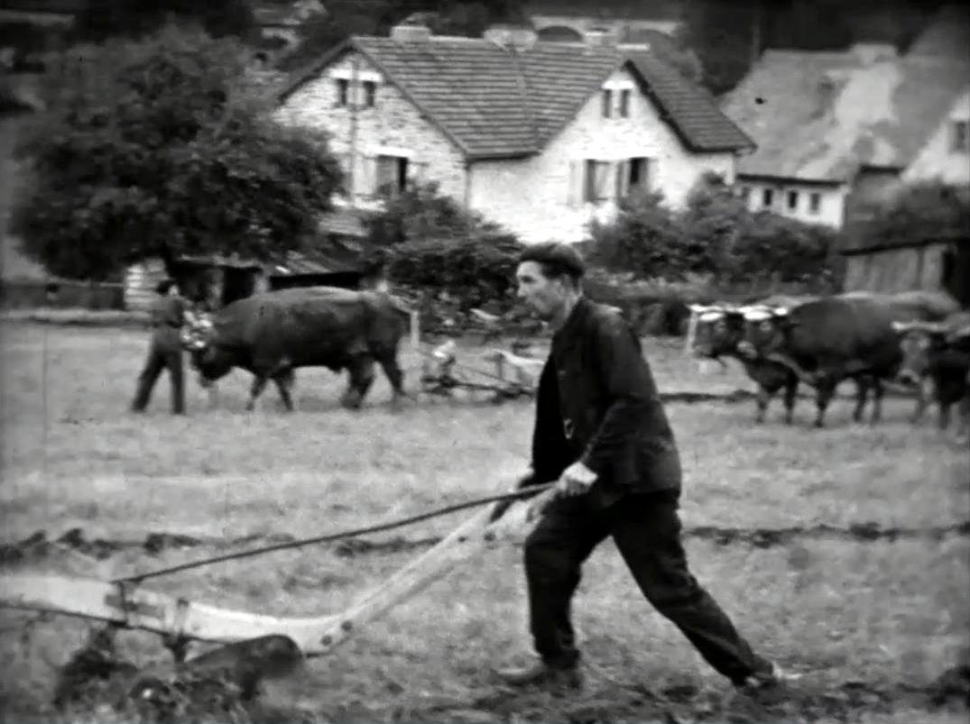 Image tirée du filmVoir le film : en cliquant iciTravail des labours avec une charrue tirée par des vaches en Haute-Vienne en 1979.