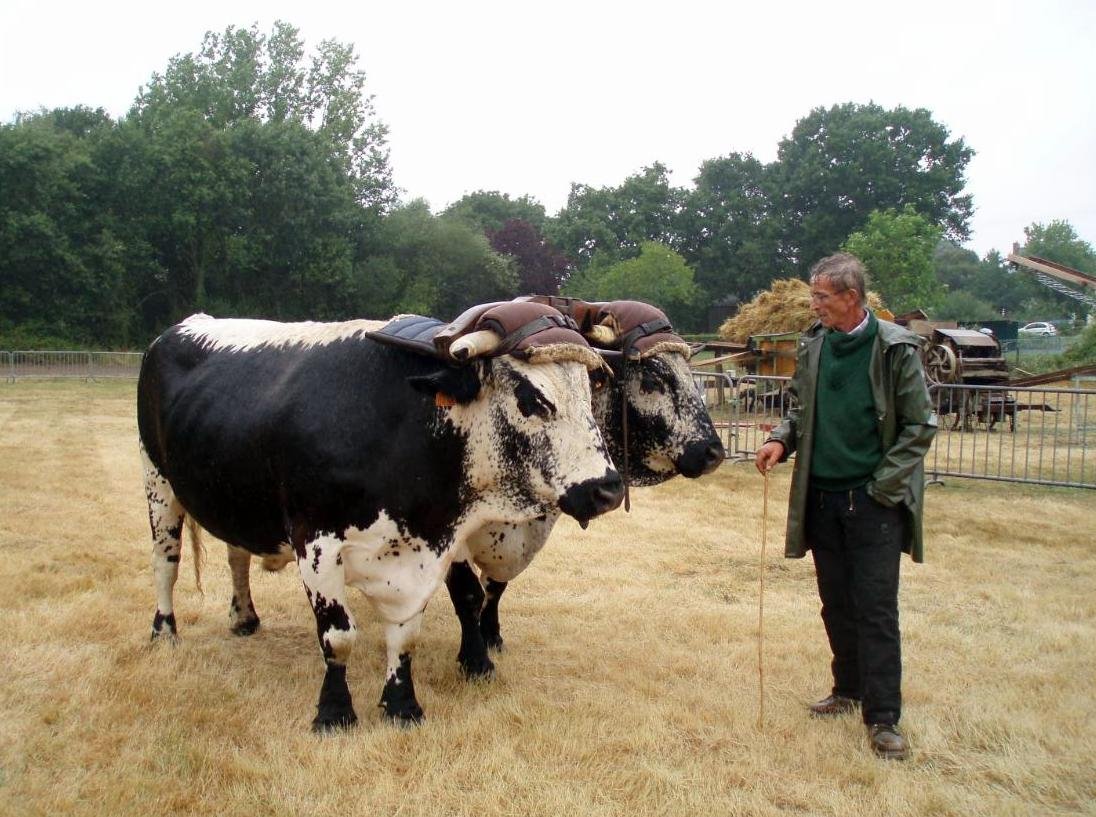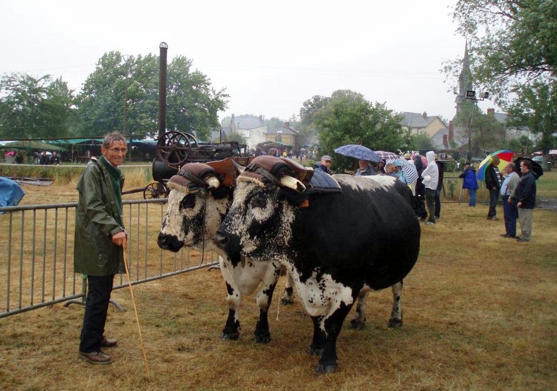Voici deux photos de la fête des battages à la Chevallerais (44) où Jo Durand était présent avec ses deux boeufs Vosgiens.