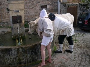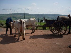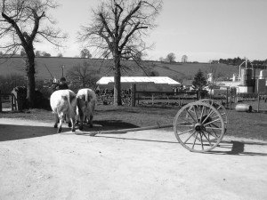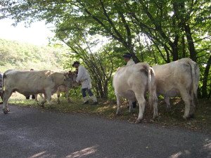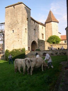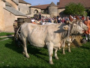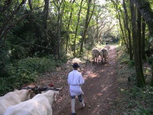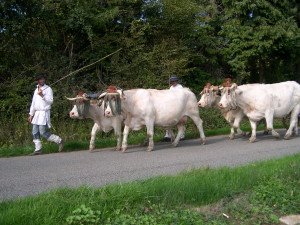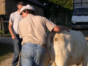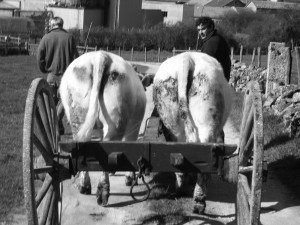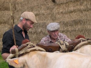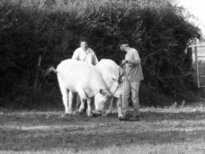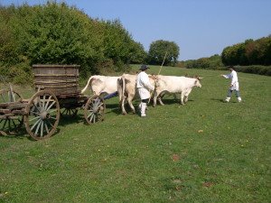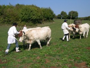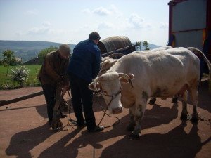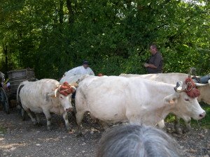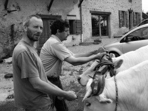 Dans un premier temps, les animaux sont moins proches de l’homme. Le dressage est fait avec moins de contacts. Une fois les bêtes habituées à suivre la paire de devant, et la reprise en main à deux encadrants, les phases de mise en confiance par rapport aux meneurs et à l’environnement restent les mêmes. Ce travail de dressage sur les deux paires a été mené avec passion et sans prétention aucune. La rencontre avec les anciens qui ont travaillé avec des bovins attelés est toujours fort enrichissante. Ils font souvent part de leur expérience et de leur savoir faire; savoir les écouter est essentiel.