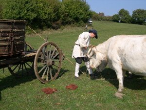 Tout au long du dressage, l’important travail de désensibilisation est à réaliser pour que les vaches soient préparées à affronter toutes sortes d’événements surprenants (Bruits divers, musique, motos, petit moteurs, ballons, chiens, parapluies ……) Ce travail est essentiel si l’on veut utiliser les animaux en toutes circonstances. Cela dit, un animal reste un animal et la prudence doit rester de mise à chaque instant. Pour la seconde paire, Annabelle et Azalée ont été dressées attelées derrière la première paire après les avoir accoutumées au joug en liberté et encadrées progressivement à deux meneurs.
