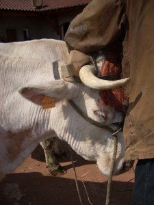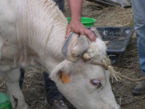 Lorsque les animaux en paire non encore liés au joug, ont acquis la faculté de suivre, s’arrêter et rester calmes, on passe à la phase de travail identique à la précédente mais en les liant à la tête par le joug. Elles sont alors solidaires ce qui peut provoquer au tout début un passage de panique, car, se sentant prises à la tête, elle peuvent chercher à résister voire à fuir. Mais en général, les bovins s’habituent rapidement. Le problème ne s’est jamais trop posé pour Vérité et Valentie.