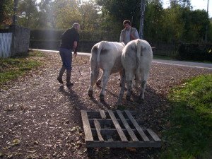 On procède par paliers en traînant à la chaîne un pneu, une palette pour que les bêtes s’habituent à avoir derrière elles un objet qui les suit et fait du bruit. Ensuite la mise au timon peut être un petit moment de stress. L’apprentissage du recul est plus compliqué car contre nature pour un animal.