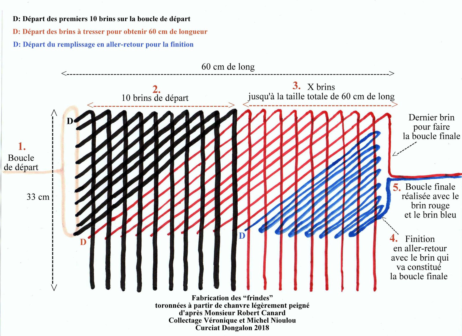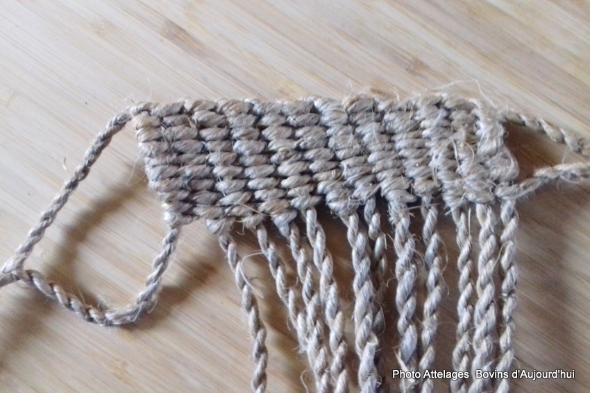 Le dernier brin long réalisé sera l’un des deux brins qui servira à faire la boucle finale et le brin long de fixation sur les bêtes. Il n’est donc pas nécessaire de le faire aussi long en bout (juste de quoi former la moitié de la boucle finale).