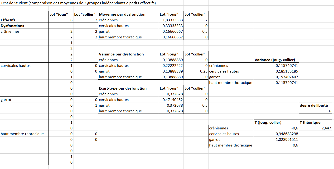 De plus, il manque dans cette étude une population de référence qui pourrait être constituée d’animaux de différents types de production ne travaillant pas. Il serait alors possible de calculer la prévalence de telle ou telle dysfonction selon le lot « joug » ou « collier » par rapport à une population de référence