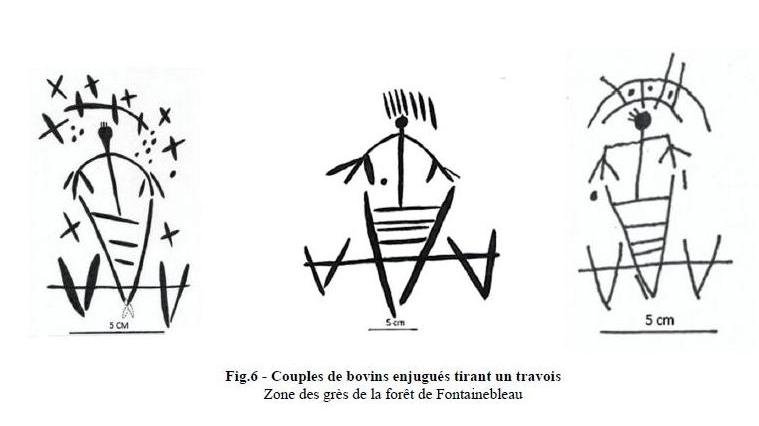 Figure n° 1: Une des représentations les plus anciennes d’attelage au joug en France : attelage de bovidés tirant un araire, guidé par un cultivateur, âge du Bronze ancien, gravures rupestres du Mont-Bégo (Saint-Dalmas-de-Tende, Alpes Maritimes, 1900 av. J-C) [3]