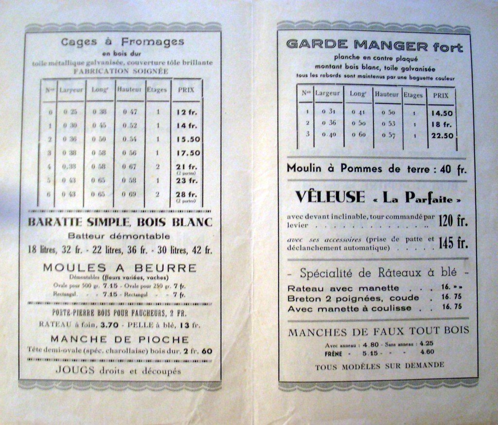 C’est ainsi que barattes, moules à beurre ovales ou rectangulaires à décors de vaches, de fleurs ou de glands, cages à fromages, garde-manger, broyeurs à pommes de terre, vêleuses, ruches en bois, râteaux à blé et à foin en bois, selles à laver, battoirs à linge, pelles à grain, manches de faux, faux à blé avec un râteau intégré, fléaux, jeannettes sur pied (50X15) de repasseuse pour repasser les manches de corsages et de chemises, des « potets » (couffin d’aiguisage ») que l’on pendait à la ceinture, et qui contenaient la pierre d’aiguisage pour affûter les faux.