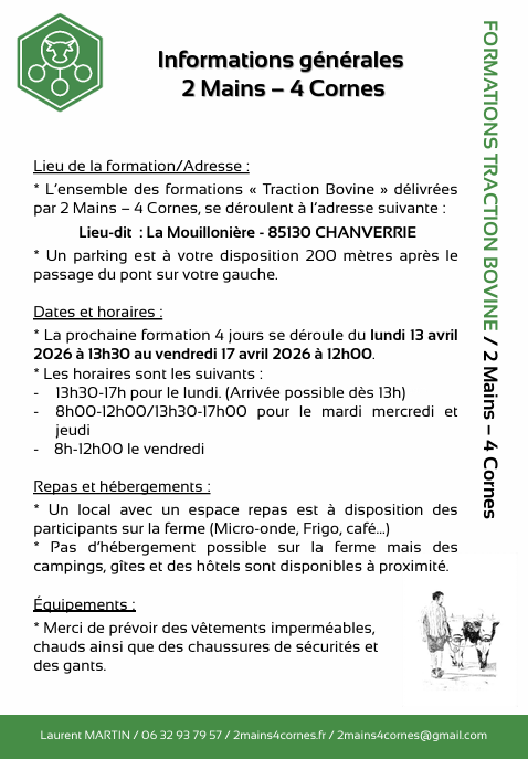 Je suis disponible pour échanger sur vos différents projets axés autour de la Traction Bovine et serai ravi de vous accueillir au sein de 2 Mains 4 Cornes pour partager mes 20 ans d’expériences avec les bovins.