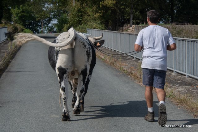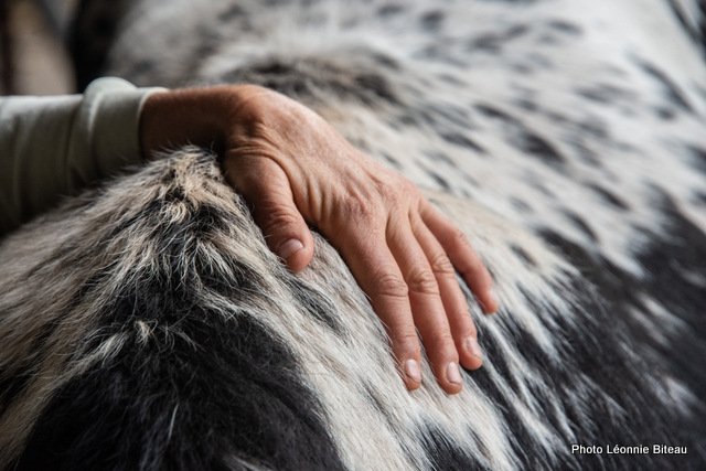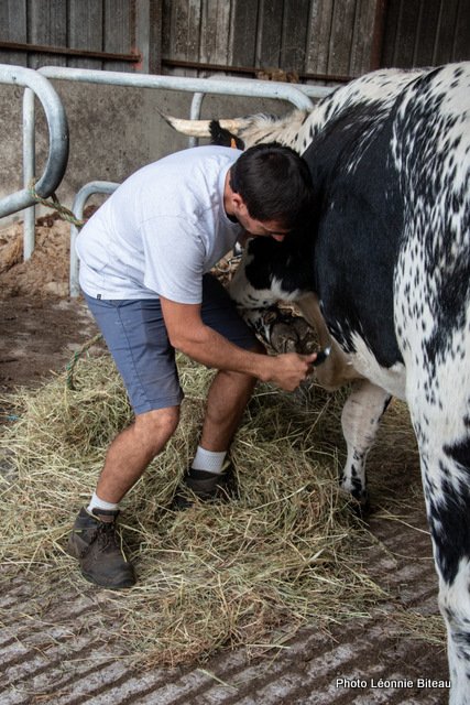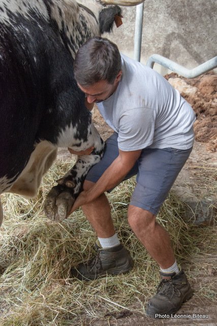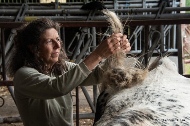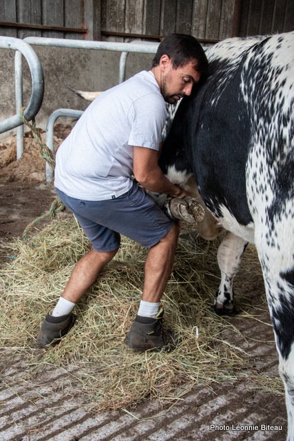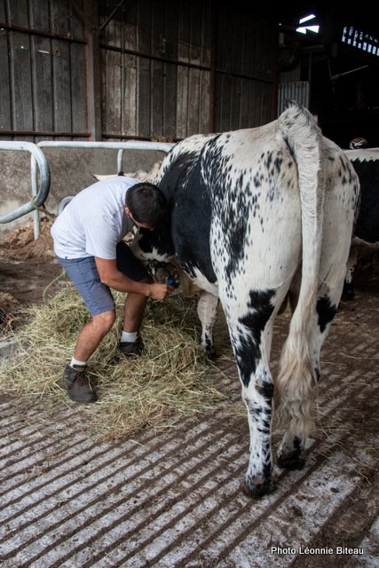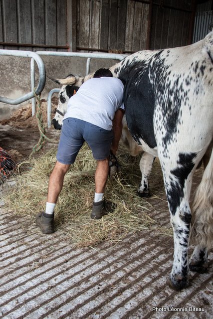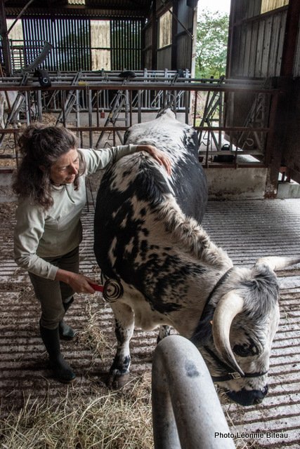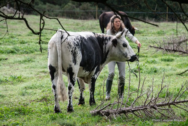 Elle profite de leur curiosité naturelle pour leur faire découvrir des objets inconnus qu’ils sont censés tirer, par exemple. Plus tard, on leur enfile même des chaussettes de yoga antidérapantes pour qu’ils puissent monter les escaliers de la maison sans crainte. Les veaux apprennent très tôt à donner ou à lever leurs pattes, ce qui est très utile plus tard, quand ils apprennent à enjamber des cordes ou quand il faut parer la corne des sabots.