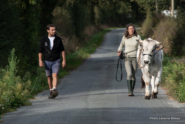 La spécialité d’Anne est l’observation du comportement et la manipulation respectueuse des bovins de trait et elle a déjà dressé de nombreux animaux. Ce week-end, elle nous a montré comment initier de manière ludique des veaux à leurs futures tâches. Pour l’entraînement, elle utilise consciemment les besoins et les élans naturels des animaux, comme le besoin de jouer après avoir bu du lait maternel : tout éleveur de bovins connaît le « sautillement » des très jeunes veaux, juste après avoir bu au pis de leur mère ou du seau contenant son lait. Anne utilise cette explosion d’énergie naturelle pour courir avec les veaux, sauter par-dessus des obstacles ou monter des escaliers.