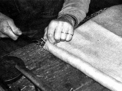 Le matériau choisi est plié et découpé, comme indiqué sur la figure 10, puis cousues ensemble à la main ou à la machine. Une ligne de couture est constitué de 6 cm à partir du bord inférieur (au sens large) de la garniture pour créer un compartiment inférieur en forme de saucisse, qui servira à fixer le tampon à l’hame. Le matériau est ensuite retourné et rempli avec un matériau de rembourrage approprié qui est disponible localement (Figures 11 et 12). Le matériau choisi doit être «souple» pour que le pad ne sera pas aplatir pendant le travail. Une des meilleures farces est poils, qui est élastique à la pression et aussi à transpirer. Il ya, cependant, un certain nombre de matières végétales pouvant servir aussi bien. Matelas décideurs locaux peuvent être une source utile d’informations sur les matériaux de rembourrage appropriées, qui comprennent carex de sable ainsi que des fibres de palmiers, agaves, noix de coco ou de sisal. L’, le compartiment en forme de saucisse inférieure doit être rempli avant du corps principal. Une fois le processus d’empotage est terminé, les bords du tampon peuvent être cousus. Le compartiment supérieur est ensuite replié (voir figure 10) et cousu en bas.