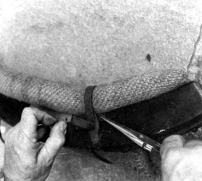 Fixation de la garniture à l’attelle appelle à une certaine habileté de la part du bourrelier. Des lanières de cuir sont passés entre le compartiment de la saucisse et le corps principal de la plaquette, enfilé à travers des trous dans les attelles et fixés (Figures 13 et 14).