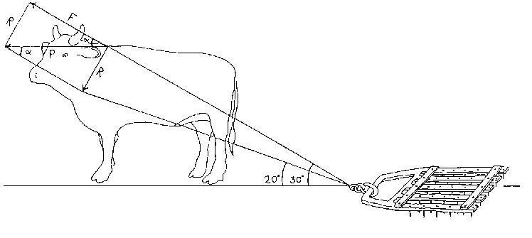Les charges sont retirés au moyen d’ traces qui relient la charge de l’animal. L’angle entre la trace et la ligne horizontale au point de fixation de la charge(voir Figure 1) est appelé angle de traction . Cet angle doit être aussi étroite que possible afin d’utiliser la puissance de l’animal au maximum. Idéalement, il devrait y avoir aucun angle du tout. Cependant, les angles se produisent, par exemple, lorsque les animaux sont attachés à relativement élevés charrettes et quand les traces sont parallèles au sol. Comme l’angle augmente, la force de traction est divisé au point de fixation de l’animal . Une partie de la force (R) est perdue pour le processus de tirage et, au contraire, exerce une pression et l’inconfort de l’animal ajouté. A titre d’exemple, si un bœuf est attelé à un joug et l’angle de traction est de 30 °, la pression à la baisse sur l’animal pourrait s’élever à jusqu’à 50 kg f. Ce calcul ne tient pas compte du poids de la carcasse elle-même, qui peut s’élever à environ 10 kg par animal.