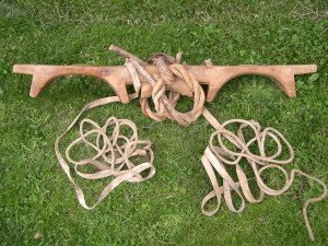 Attelles . Les attelles sont formées à partir de deux morceaux de bois, en forme pour épouser les contours de l’animal (voir Figure 9). Ils doivent être fabriqués à partir du disque, mais le bois élastique, par exemple, le bois utilisé localement pour la fabrication de manches d’outils agricoles tels que des haches ou des houes. Il est important de veiller à ce que le grain du bois longe la courbe, car cela renforce les attelles. Si le grain ne suit pas la courbe, ou s’étendant dans la direction opposée, les attelles peuvent se briser – en particulier au niveau des points où les traces sont attachés ou lorsque la courbe est la plus accentuée.