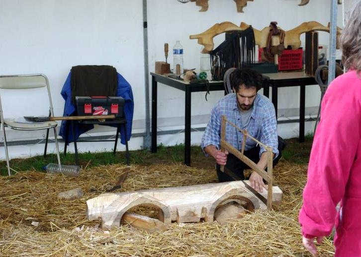 Laissac, froid matin de décembre 2012. Avec René ALIBERT nous sommes invités à participer à la foire des bœufs gras de Noël pour montrer la fabrication des jougs. René travaillera à l’herminette pour en achever un, moi, je continuerai à la hache celui que je commençai de tailler la veille afin de ne pas prendre un morceau trop lourd.