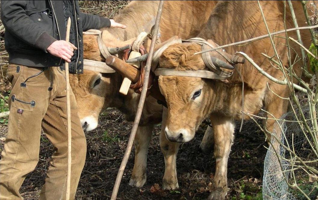 Les deux bœufs étaient alors amenés et placés côte à côte, comme ils devaient être bons à l’attelage. Le jougatier après avoir dégrossi le bois à la hache procédait à des essayages. Travail délicat : le joug ne doit pas blesser la bête ; il doit s’adapter à la forme des cornes, particulières à chaque bœuf.