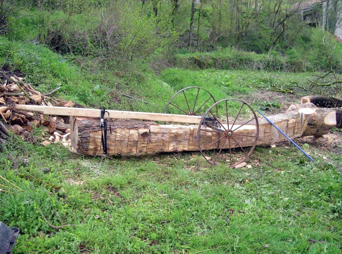 Lionel Rouanet, nous a communiqué quelques photos sur l’équarrissage manuel et la sortie de la parcelle, d’une grosse bille de chêne avec un petit trinqueballe à la limite de sa capacité.