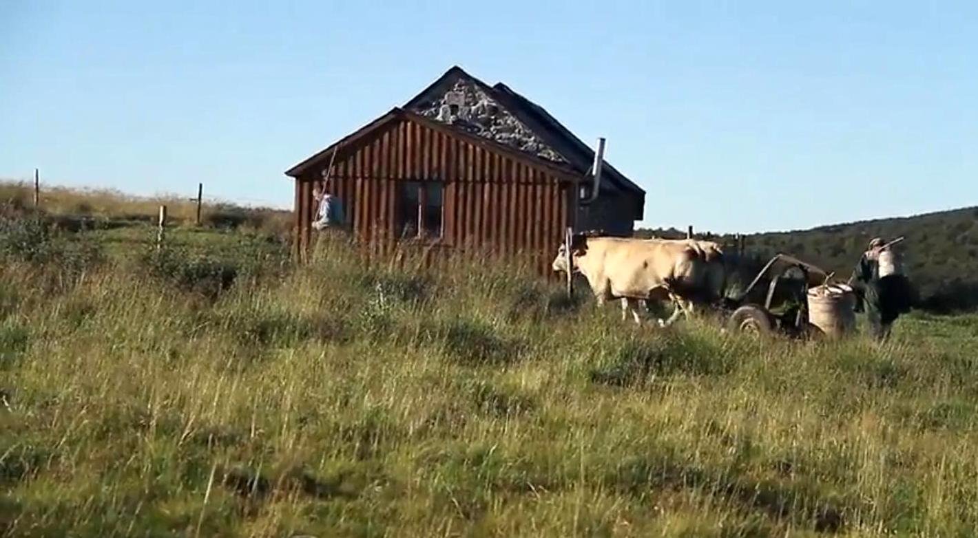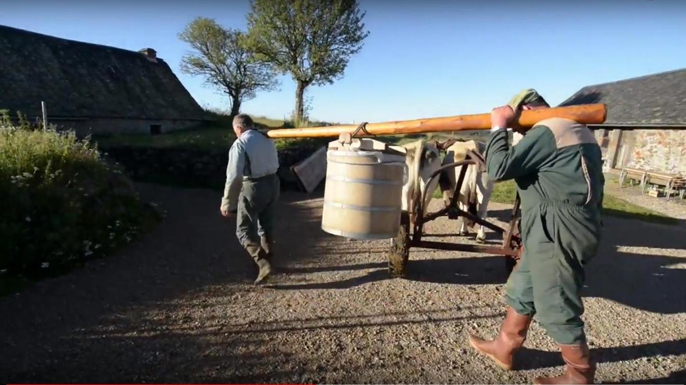 La famille Ramon utilise une paire de vache Aubracs pour ramener la traite quotidienne au buron.