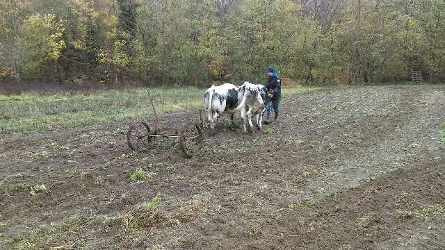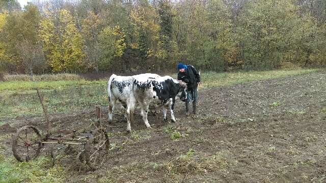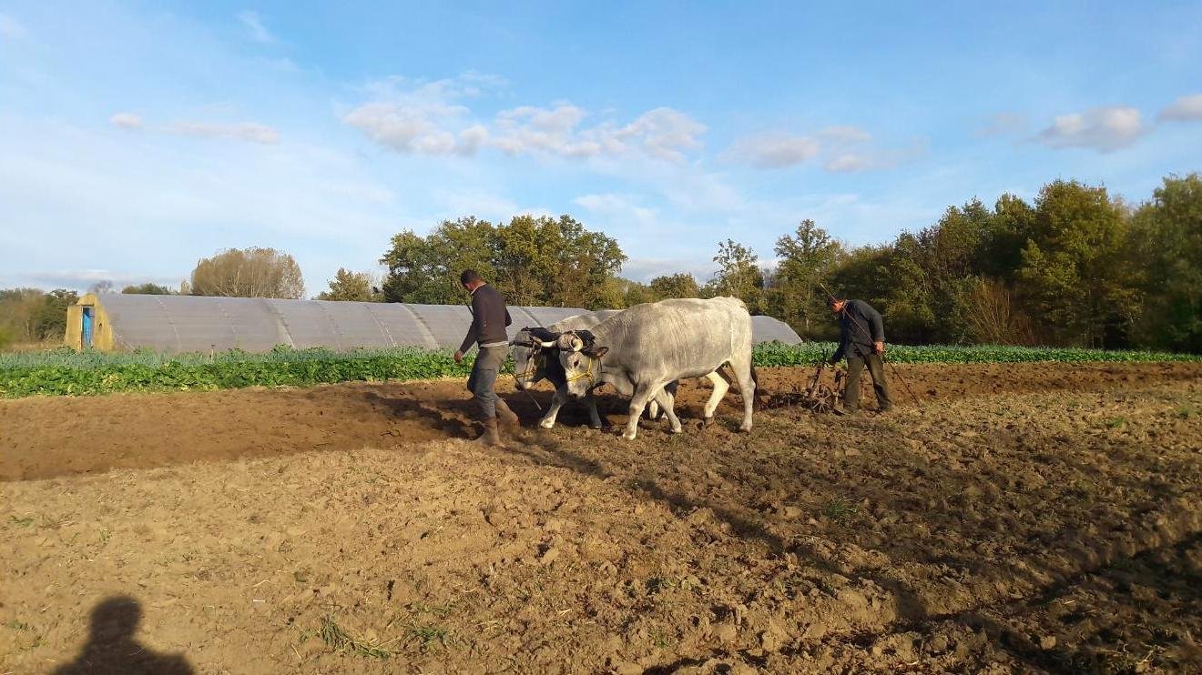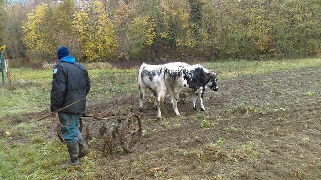 Labour au brabant et petits travaux avec deux boeufs Gascons chez Laurent Janaudy, Manziat (01)