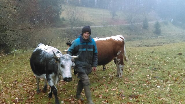 Après avoir travaillé pendant une huitaine d’année avec une paire de vaches Aubracs, il a dressé deux boeufs Gascons. Ils travaillent déjà depuis quelques temps au charrois et à la herse.