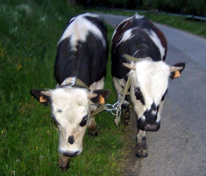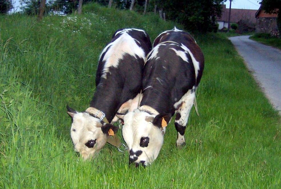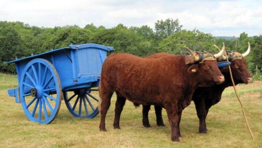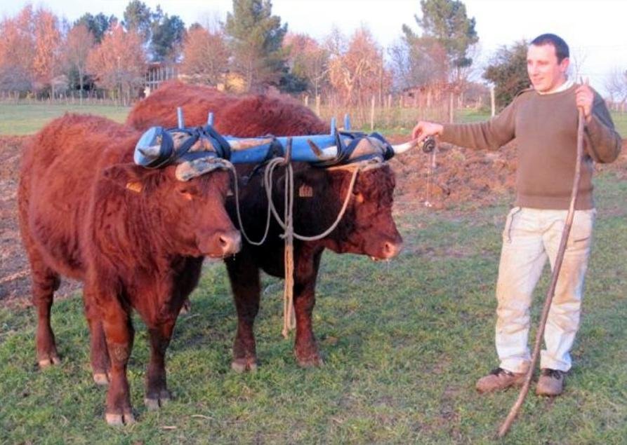 J’ai pour projet de développer la traction animale pour réaliser du transport sur la ferme et environs proches (de marchandises, voire de personnes) et pour faire le foin (il est fait chez nous par un voisin pour l’instant). Ce sont des jersiais alors je sais qu’ils ne seront pas extrêmement puissants mais au collier et castrés sur le tard, j’espère qu’on pourra quand même faire des choses intéressantes. Les chevaux prendraient le relai pour les tâches plus difficiles, dans mon système je pense que ça sera la fauche et le transport du foin. Ils n’en sont qu’aux bases. Ils marchent en licol et en longues rennes, seul et en paire mais il y a encore du boulot.