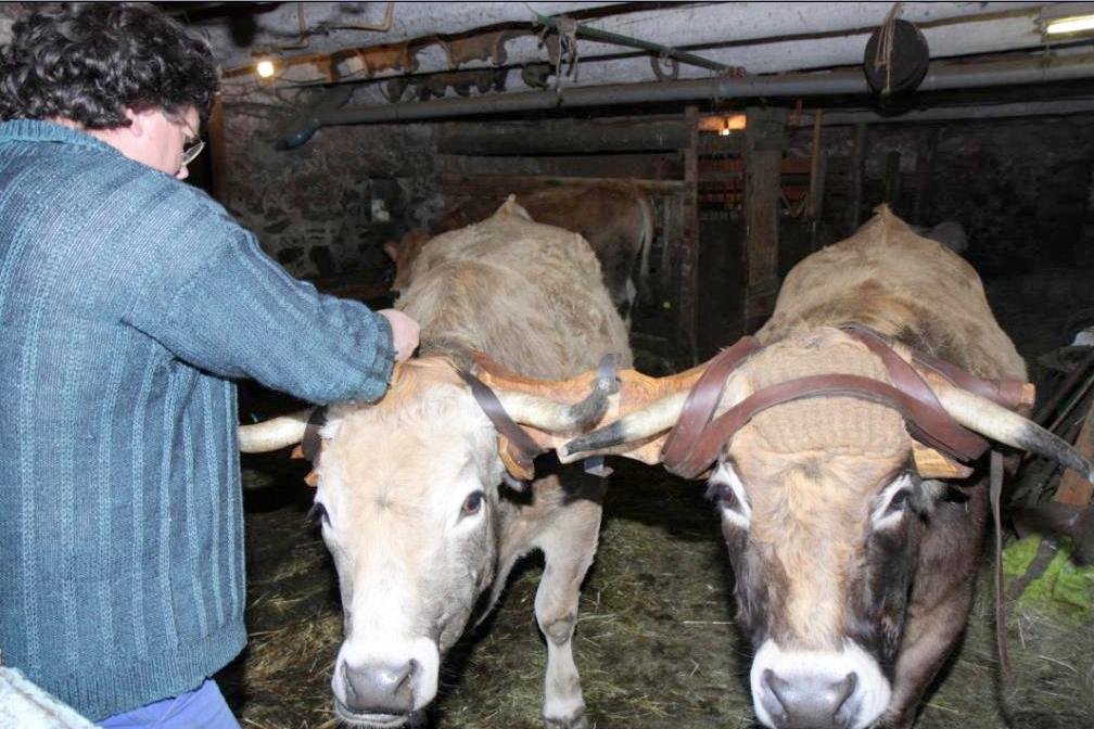 Récemment, il s’est retrouvé avec une seule vache dressée et n’attelle donc plus en ce moment, mais va dresser prochainement une vache pour reformer la paire.