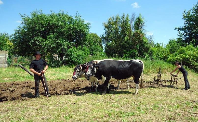 Pour ce travail, un seul boeuf a été nécessaire, attelé au collier avec un harnais et un palonnier.