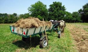 Début juillet, paillage d’une parcelle de pommes de terre avec les boeufs attelés à un avant-train et une remorque. Le but de ce paillage est d’éviter la repousse des adventices et de conserver l’humidité du sol. Cela diminue le travail d’entretien de la parcelle.