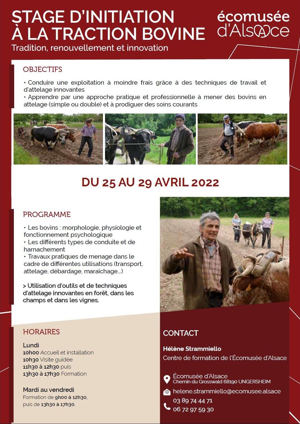 Revenons un peu en arrière dans notre chronologie pour évoquer un grand acteur de la traction bovine – l’Écomusée d’Alsace. En pleine crise d’existence de l’Écomusée en 2006-2007, François Kiesler, chargé du programme de l’agriculture, et le bouvier Philippe Kuhlmann ont malgré tout accueilli la rencontre des Ethnozootechnie Bouviers d’Alsace (Simon, 2007), à laquelle ont participé des spécialistes de la traction chevaline comme Jean-Louis Cannelle du Centre Européen de Ressources et de Recherches en Traction animale (CERRTA) ou Pit Schlechter de la Fédération Européenne du Cheval de Trait pour la promotion de son Utilisation (FECTU). Ces rencontres se sont poursuivies chaque année depuis et ont vite attiré l’attention de participants étrangers – luxembourgeois, belges, britanniques, suisses, et surtout, bon voisinage oblige, de nombreux allemands. Depuis le début, Philippe Kuhlmann a littéralement fait le pont entre Français et Allemands à travers des réunions dans les deux pays, aujourd’hui renforcées par l’accueil de stages de formation de bouviers deux fois par an au sein de l’Ecomusée d’Alsace. Certes, ce n’est pas le seul exemple de formations – le CFPPA de Montmorillon (Coti, 2014), tout comme des privés comme Olivier Courthiade ou Emmanuel Fleurentdidier, en ont proposées – mais c’est sans doute celle avec l’histoire la plus riche et le rayonnement le plus durable.