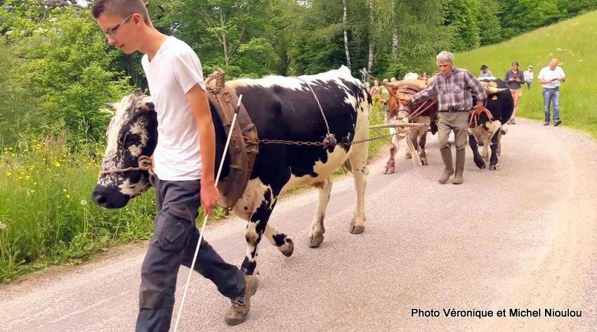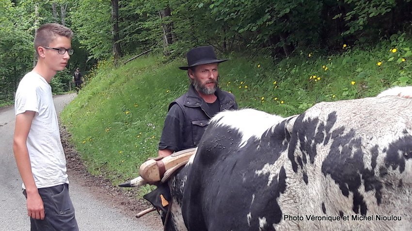Il travaille, en leur parlant la langue Vosgienne, soit avec les animaux de son père, soit avec Moris, le boeuf de Karine Huguenot.