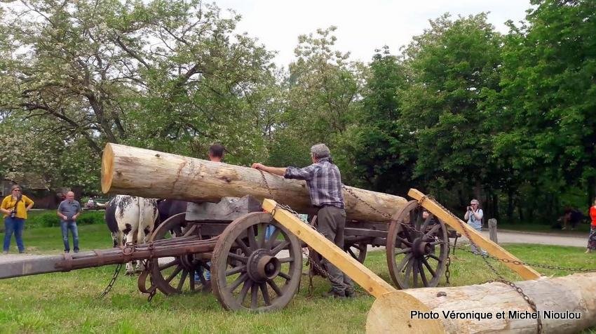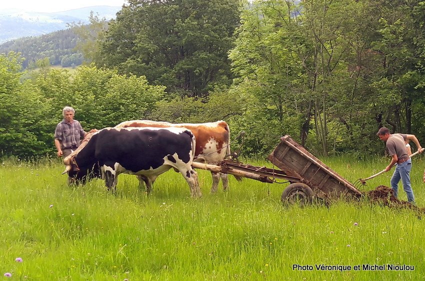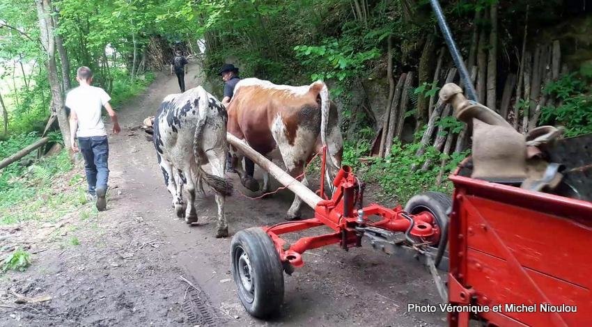 Débardage, transport du fumier et autres denrées, Emile pratique toutes sortes de travaux avec les boeufs. On peut signaler aussi qu’il attelle à l’écomusée d’Alsace.