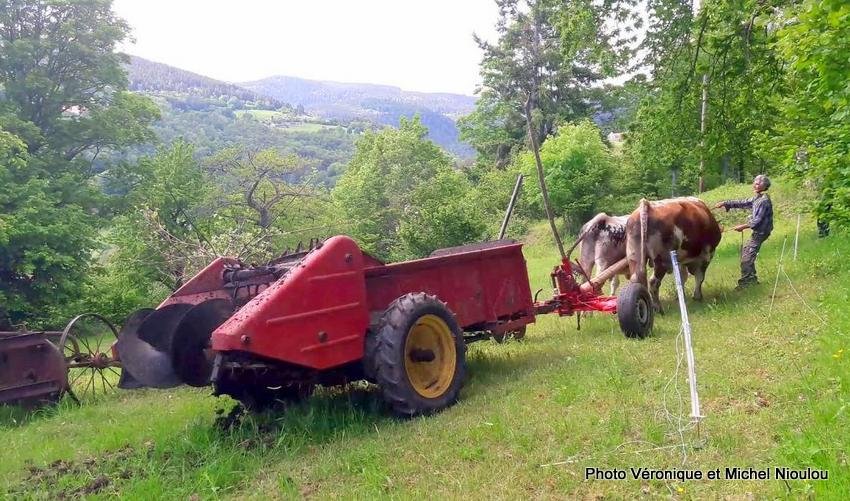 Cette moisson va se faire avec Tino, bœuf vosgien de quatre ans, dressé au menage en solo par l’arrière. Là, on n’a pas mis la charrue avant le bœuf, mais le vallus.