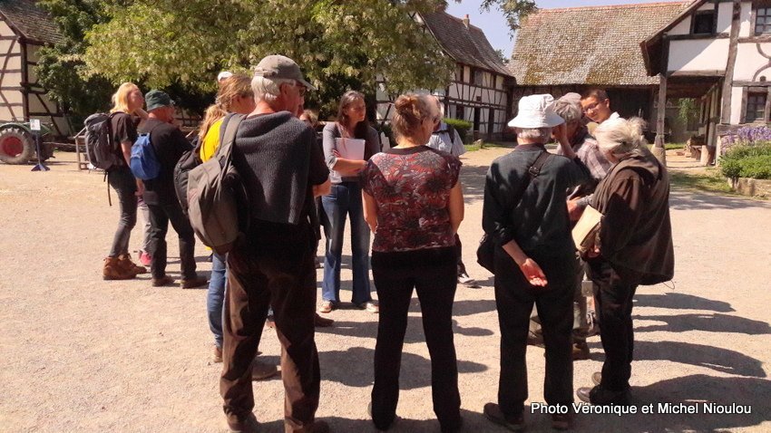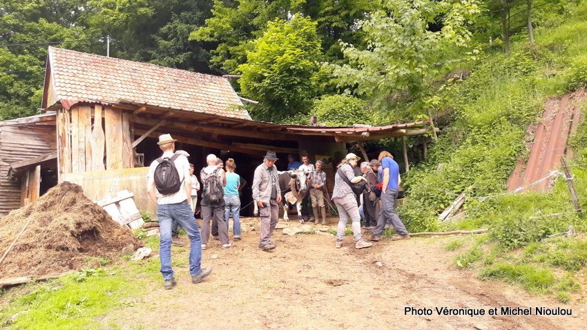 Jo Durand a pris en guide un jeune boeuf Vosgien qu’il a progressivement mis à la traction, en particulier au griffage dans l’espace des vignes. Il avait aussi deux jeunes vaches Vosgiennes utilisées par une équipe de réalisation de torchis en terre. Les deux bêtes menées en guide brassaient la terre humidifiée en la foulant aux pieds au fond d’une tranchée circulaire. Les bêtes ont été menées sans encombre par les membres de l’équipe des maçons, malgré le travail répétitif en rond serré que les animaux ont ordinairement parfois du mal à réaliser sans énervement.