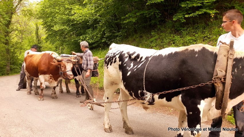 Pierre Nabos avec ses deux belles vaches Béarnaises a démontré une nouvelle fois ses qualités de dresseur et de meneur avec deux animaux calmes, parfaitement aux ordres et volontaires au travail.