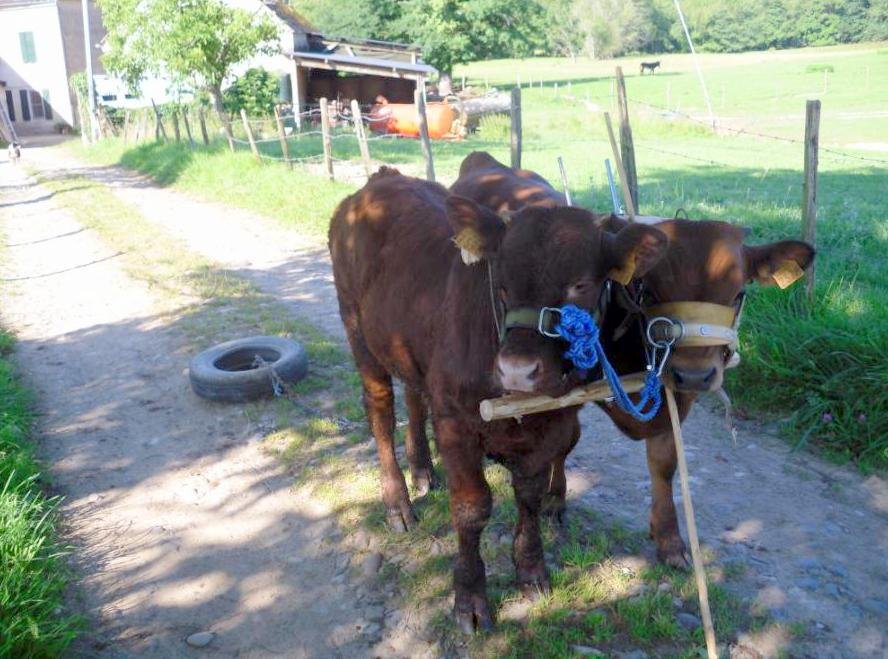 Cette paire un peu hétéroclite me permet de me faire la main. Agés de 2 ans et demi, ils sont au joug depuis 6 mois et poursuivent leur éducation en tirant un gros pneu, une petite herse et depuis peu un tombereau. Je les considère eux-aussi comme de très bons et très agréables élèves! Deux velles bérnaises doivent arriver chez moi à l’automne et suivront le même parcours…….