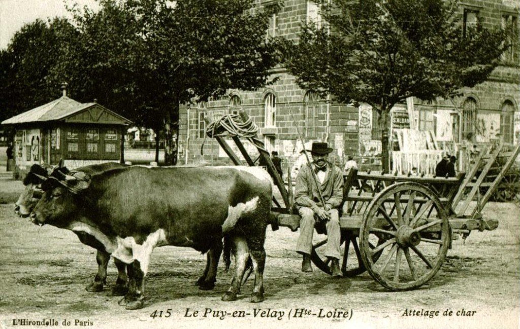 Ce bouvier endimanché conduit son attelée par le côté gauche, position qui assure une vision d’ensemble et une conduite précise de l’attelage.
