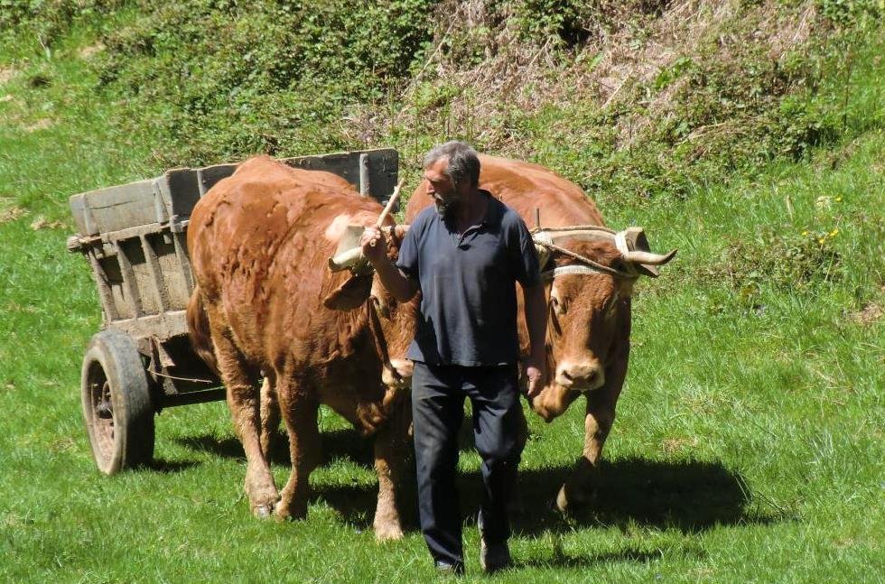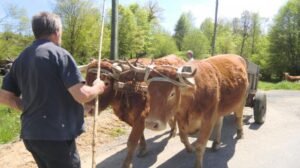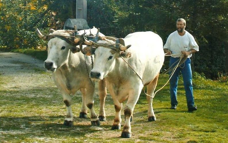 Jo Durand, le régional de l’équipe, avec ses animaux Vosgiens, un boeuf solo et deux génisses en guides.