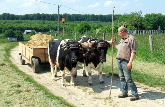 Les deux bœufs normands, issus d’un élevage de Bosc-Hyons, sont encore en phase d’apprentissage. « Cela a été un peu dur au début, mais ça va de mieux en mieux ! sourit Frédéric. Il a fallu notamment les apprendre à tourner. Et lorsqu’ils voient un peu d’herbe, ils s’arrêtent parfois pour brouter…  »