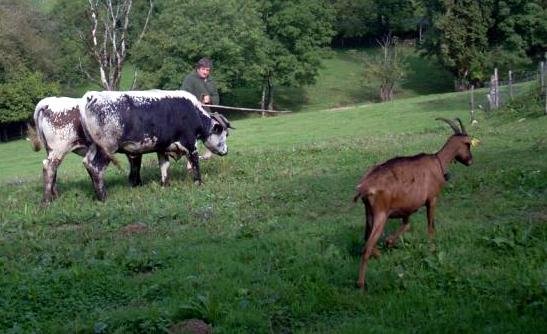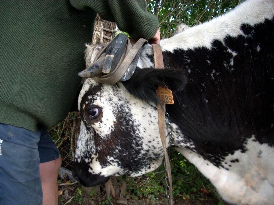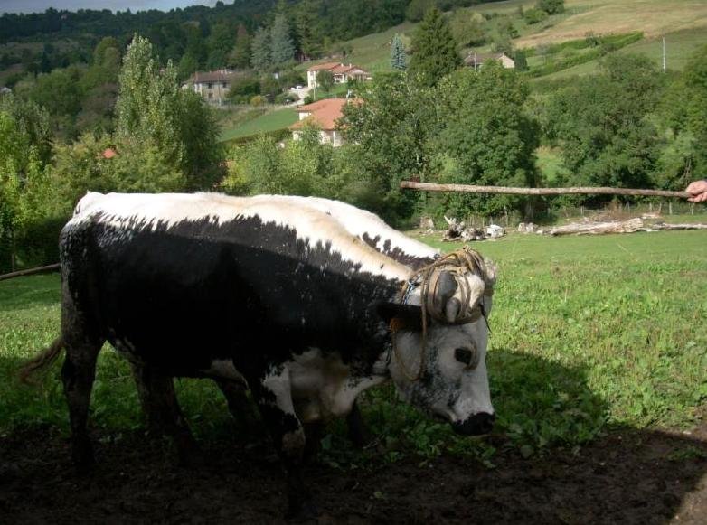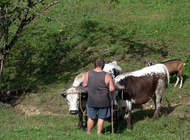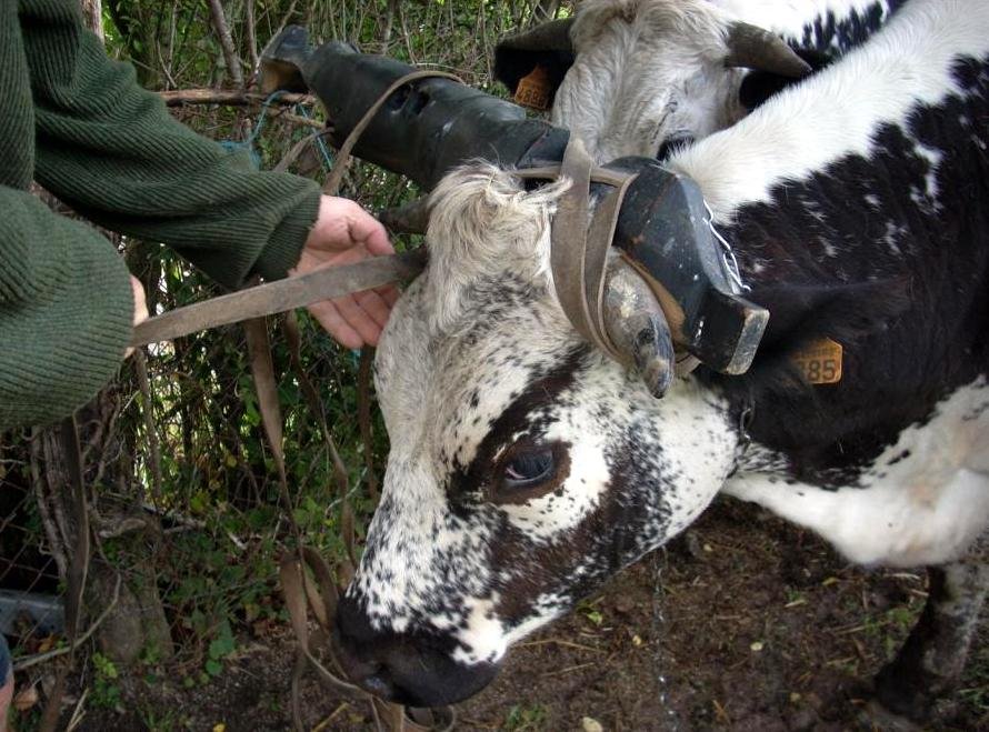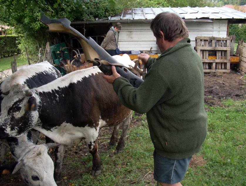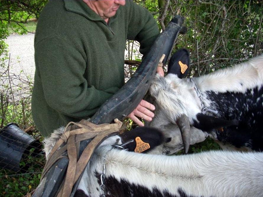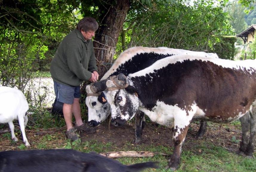 A 60 ans, homme de cheval depuis toujours, il a décidé de renouer avec les bovins attelés pour faire ses petits travaux sur les quelques hectares qu’il exploite dans ces contreforts du Jura fortement escarpés.