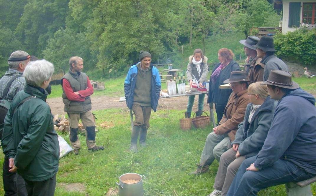 D’ici et d’ailleurs, voici les mots clefs de toutes les réunions des « Bouviers « d’Alsace », depuis les débuts en 2005 à aujourd’hui, avec des participants venus cette fois de Belgique, de Suisse, d’Allemagne et des points cardinaux de France, du Massif Central à la Bretagne ou de la région parisienne, pour le week-end de l’Ascension du 26 au 29 mai, chez Philippe Kuhlmann à Soultzeren dans le Haut-Rhin. Lors de notre arrivée à quatre dans la voiture « Bretagne», des travaux sont déjà en cours au bord de la route menant à la ferme, Gesellenmatt, à la sortie du village, où Philippe utilise sa motofaucheuse manuelle et où toute une équipe est déjà en train d’andainer. Les bœufs aussi sont déjà au travail, puisqu’ils transportent les foins vers l’amont pour approvisionner les autres animaux parqués dans les champs près de la maison.