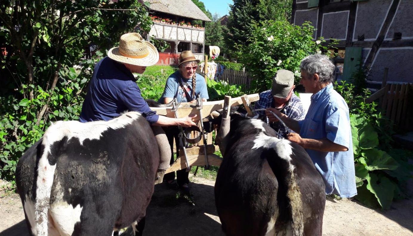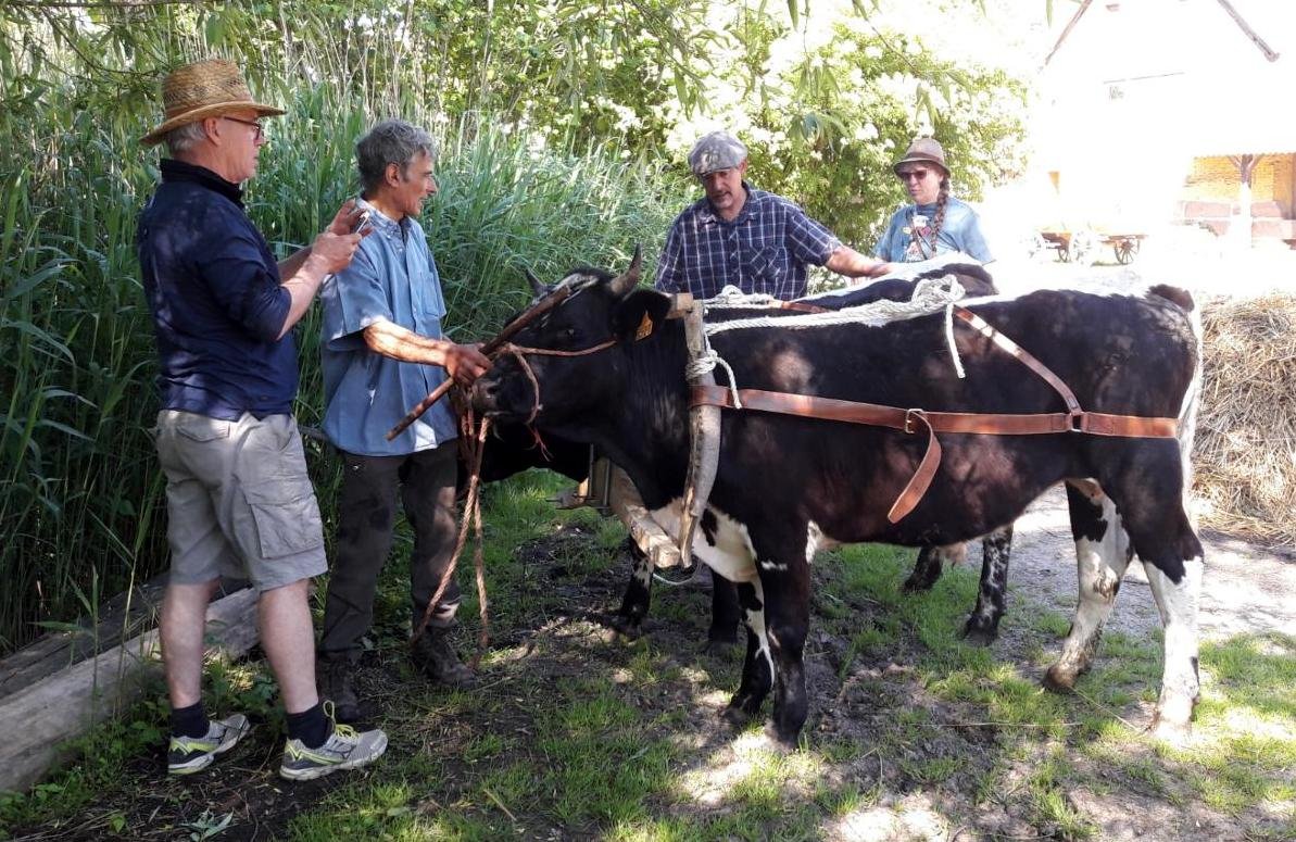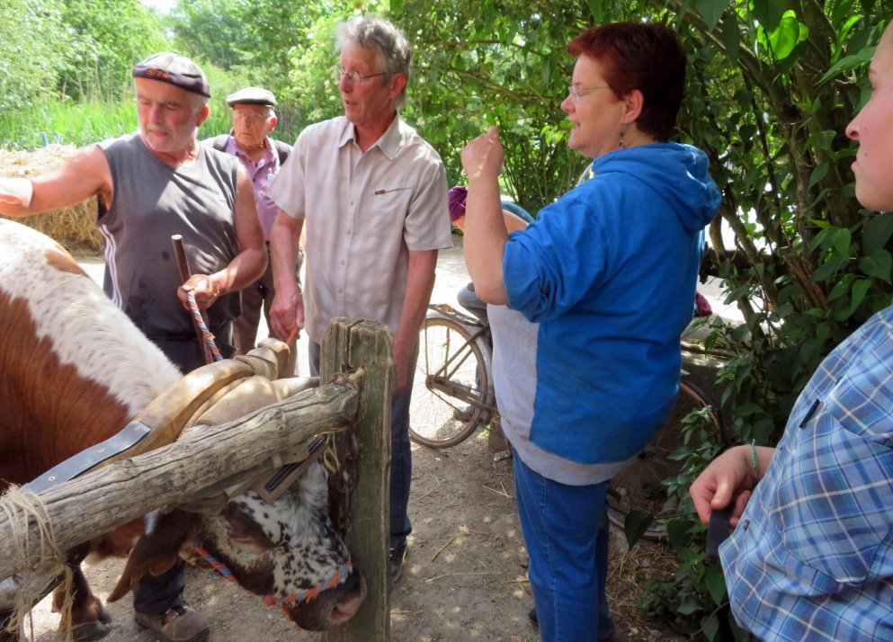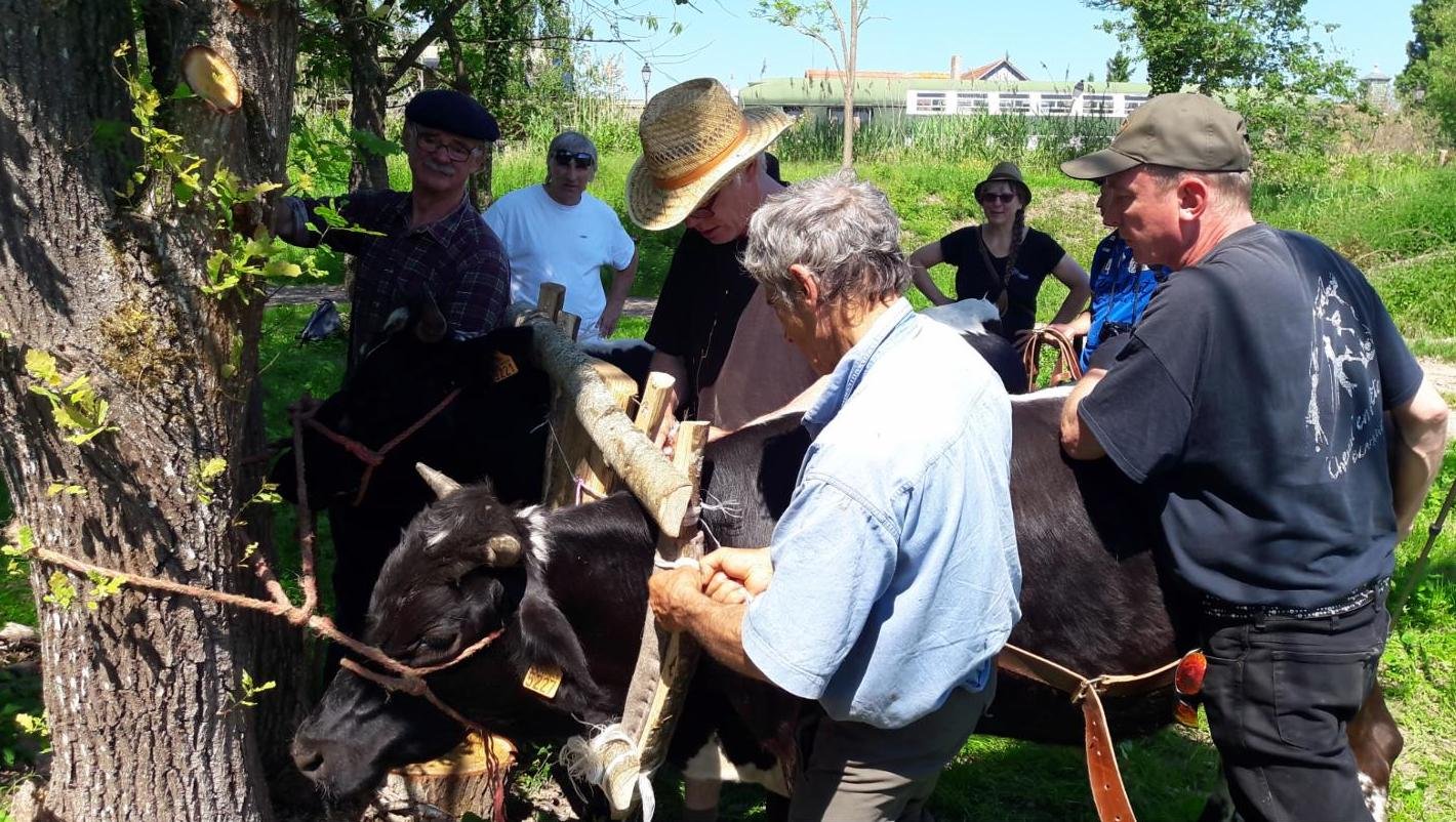 Le groupe de jeunes bouviers vendéens prouve qu’ils aiment chanter, mais ils prennent également le micro pour rendre compte de leur stage chez Michel Nioulou, pilote du blog « Attelages Bovins Aujourd’hui » et jougtier expérimenté. Très naturellement, le ludique se marie avec le pédagogique. Il y a des activités comme la démonstration de fauchage et d’andainage traditionnels sur la pente – une association de travaux intimement liés avec la traction bovine. Christine Arbeit, pilote du groupe Facebook des bouviers, informe régulièrement tout le réseau français des faucheurs sur les événements associés à l’attelage de bœufs, pour encourager tout le réseau de métiers essentiel à l’utilisation de la traction animale.