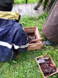 Mais ce n’est pas la fin de la journée, loin de là, puisque d’autres arrivent encore, parmi lesquels Anne Wiltafsky, Allemande et experte en comportement bovin. Elle fait une introduction informelle sur la manière d’explorer les points « timides » d’un tout jeune animal, à l’aide de l’étrille. Chaque moment passé ensemble le vendredi fournit ainsi l’occasion de s’entraîner pour le programme du lendemain au village du Valtin. Tôt le matin à Soultzeren, Daniel Viry, spécialiste de débardage et habitué des fenaisons à l’ancienne, a fauché l’herbe sur le coteau près de la pâture des bœufs pour préparer sa participation à plus grande échelle au Valtin. Mais tout le monde attend aussi un autre « événement » qui vient à point nommé, le Manuel d’attelage bovin – comment choisir, soigner et débourrer de Philippe, dont nous avons vu la tout première version en 2019. En effet, les cartons contenant les exemplaires de la seconde version du livre sont arrivés juste avant les participants.
