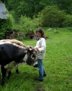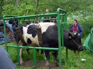 Après la traite matinale à la main dans son étable, Philippe accueille les premiers participants de la journée du jeudi. Tous se présentent et expliquent les raisons très diverses de leur intérêt pour les bovins de travail. Nombre d’entre eux viennent, comme la vétérinaire suisse, pour rencontrer Pauline Ernewein, l’ostéopathe animalière. Grande habituée des chevaux, Pauline relève avec fougue le défi d’aborder les bovins. Elle commence donc à démontrer le savoir-faire des ostéopathes professionnels pour traiter les animaux, ici les bovins, attentive à tout signe d’inconfort ressenti par l’animal, comme de ne pas bien équilibrer son rythme de marche entre le côté gauche et le côté droit. Un tel bœuf est pour ainsi dire « perdu dans ses pattes » et il faut savoir où le masser pour corriger ce déséquilibre.